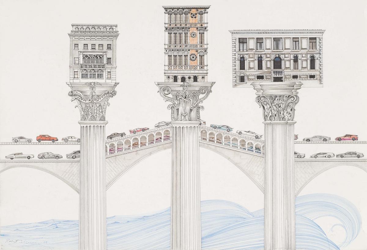 I started with 3 classical Roman columns of three different orders and thought I would wing it from there. On top of these I put three historic Italian style buildings - one is actually at Yale. They looked like little bird houses. Then I decided to put a bridge connecting them which would help to determine their scale. Then since I had the bridge I put cars on it, giving it a further sense of scale. Then I thought the bottom was a little empty so I put in a tsunami.